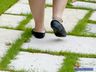 Exhibition sur des rochers en mules chinoises et bas couture.